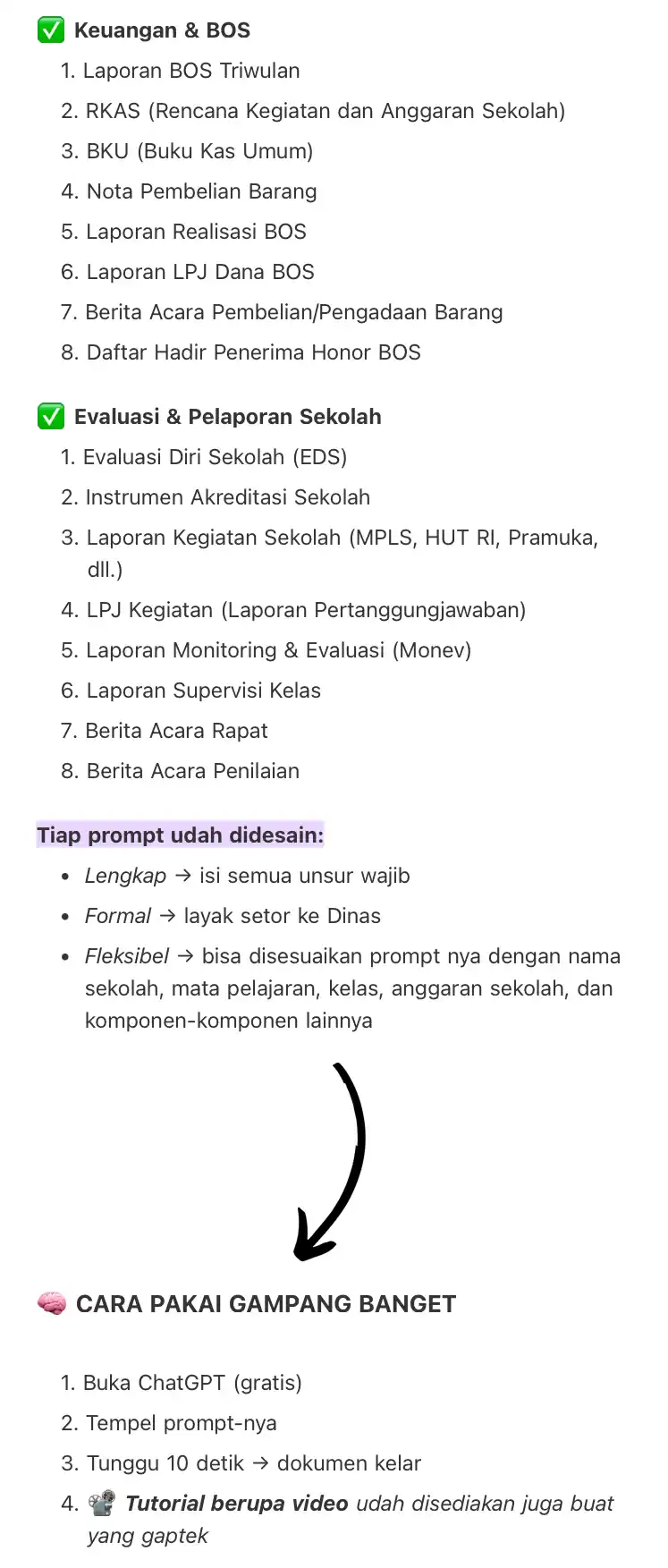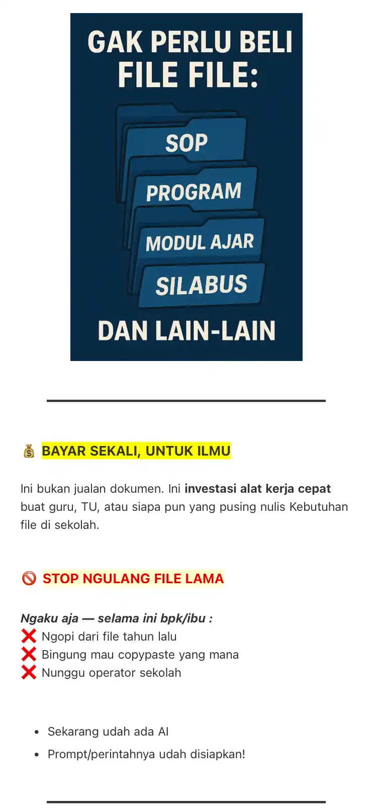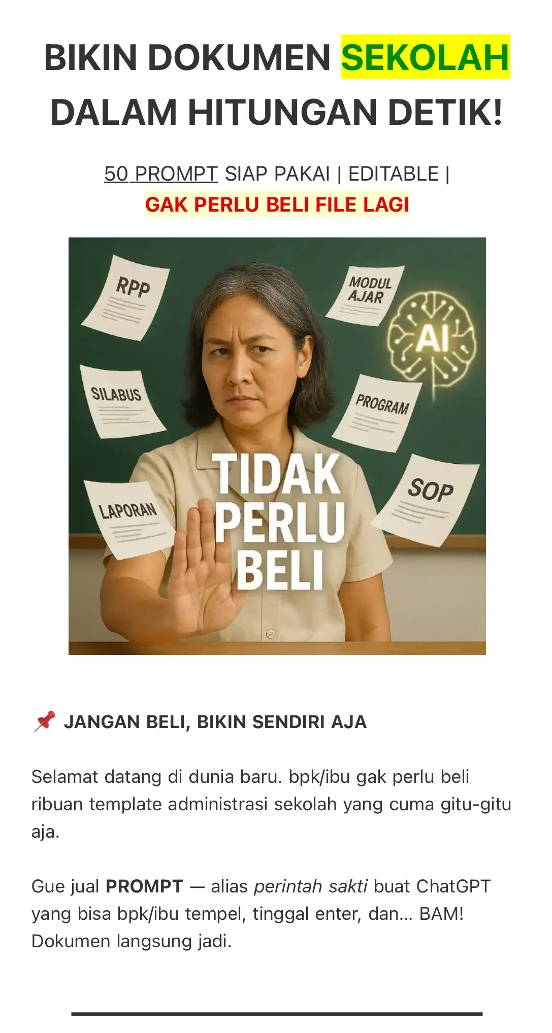 Guru tidak perlu lagi lembur atau copy-paste dokumen. Semua administrasi beres dalam hitungan menit. Mulai dari RPP, Modul Ajar, Silabus, Program Tahunan, sampai Laporan BOS & LPJ—semua sudah tersedia, tinggal edit sesuai kebutuhan. Bentuknya prompt pintar, bukan file mati. Bisa dipakai berkali-kali, diedit kapan saja, bahkan untuk tahun ajaran berikutnya. Tidak ada biaya langganan. Cukup sekali beli, bisa dipakai terus tanpa batas waktu.